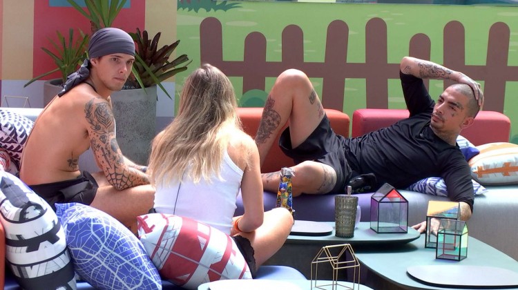 Bruna Griphao, Gabriel e MC Guimê conversam sobre formação do paredão — Foto: Foto: Globo