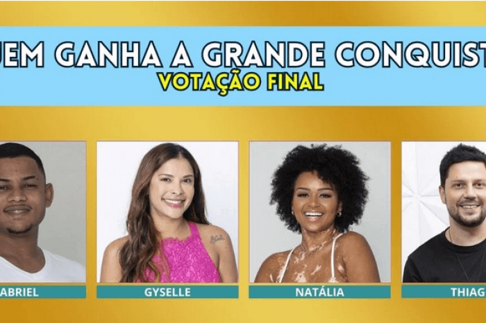 A final de A Grande Conquista já está chegando e os finalistas foram definidos na última terça (18). Entre Gabriel Roza, Gyselle, Natália e Thiago Servo, quem você quer que vença o reality show? Deixe seu voto na Enquete A Grande Conquista Final.